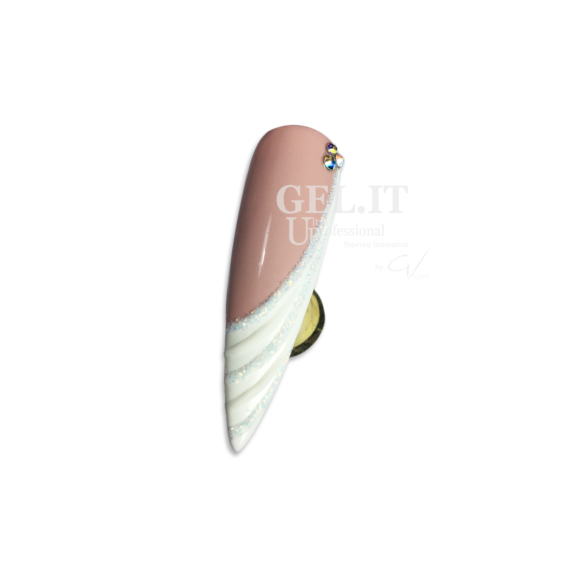 For an impressive bridal design, dare to combine matte with shiny details. In the “All About The Bride” Bridal Design you will see a step by step French Design with nude shades. Prepare the nail for your gel polish manicure and then apply a nude GEL.IT.UP by GIUP® N010 Frappelicious and cure. We paint the French with a white GEL.IT.UP by GIUP® FFF White Years Ahead with an angle and cure. With GEL.IT.UP by GIUP® 3D Paste White we do three fine lines in the same direction as the French design and before curing, sprinkle with GEL.IT.UP by GIUP® Stone Collection Glitter, and cure. With GEL.IT.UP by GIUP® 3D Paste White we make two more lines between the previous ones and before curing we drop GEL.IT.UP by GIUP® Acrylic Powder Compete Clear, to give a matte effect and then cure. For a brighter and more impressive result, put small crystals on top of the French design for a more impressive finish!